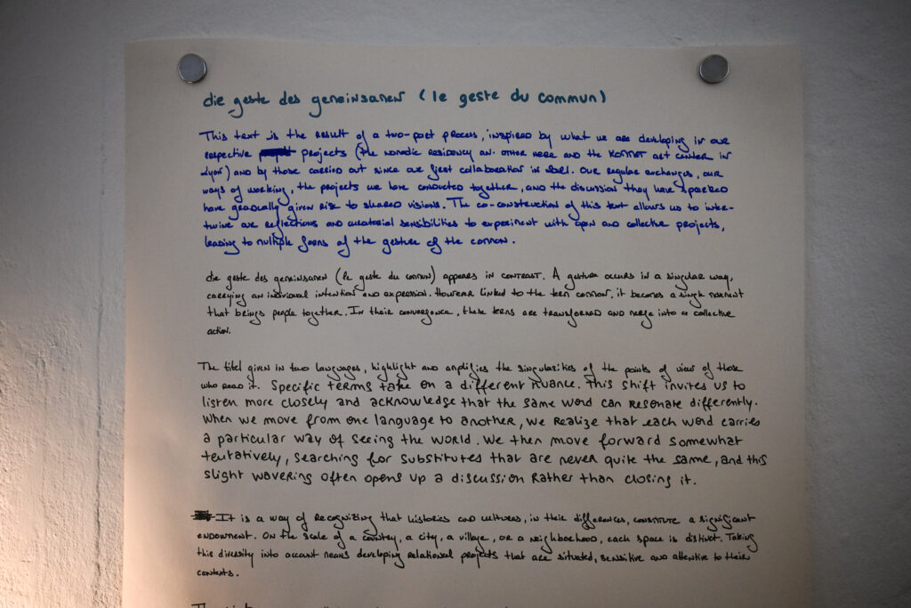 die geste des gemeinsamen (le geste du commun) est une collaboration artistique franco-allemande portée par le centre d’art KOMMET(Lyon), en partenariat avec la résidence nomade an· other here et l’Institut für Alles Mögliche(Berlin). Conçu comme un laboratoire transnational et évolutif, le projet se déploie à travers plusieurs volets : résidences, ateliers de pratique artistique, expositions, performances et rencontres. Il explore des formes possibles de réparation et de réinvention sociales et écologiques, tout en engageant des gestes de résistance. Lors d’événements, practicien·nes de l’art, chercheur·es et publics sont invité·es à questionner et à expérimenter les manières de faire du commun.