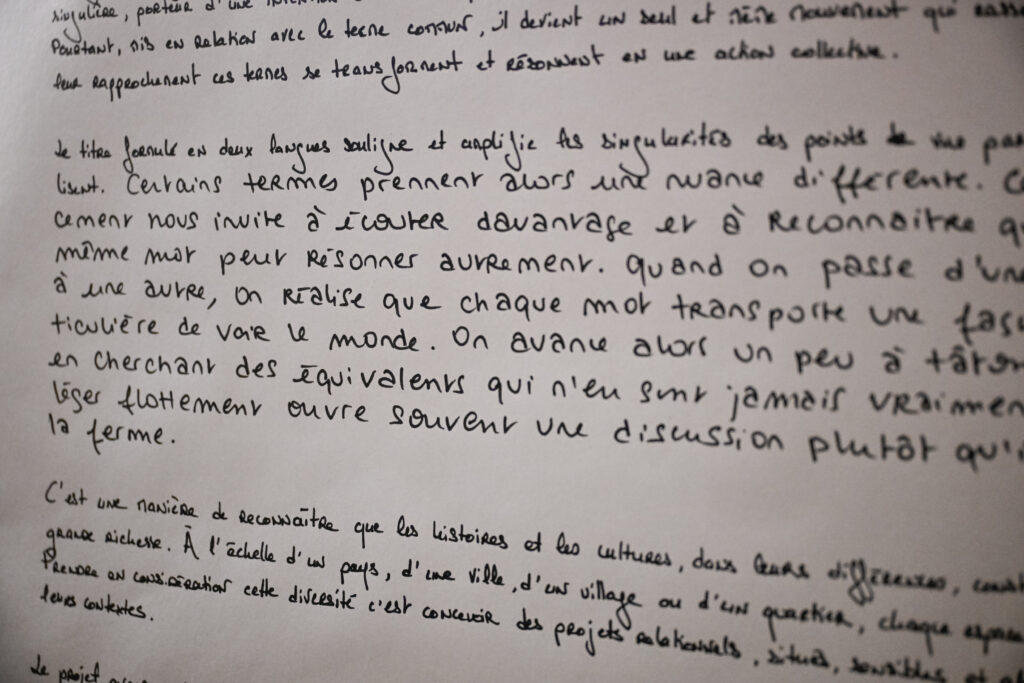 À KOMMET, l’ensemble prend place dans une cabane tapissée de velours, un espace feutré qui invite le·la visiteur·euse à entrer. L’installation crée un cadre intime et paisible, propice à la lecture. Les lettres, que l’on peut prendre en main, se découvrent comme les pages d’un journal intime ou d’un conte. Écrites au stylo Bic et parfois marquées de ratures, elles évoquent tour à tour l’amour, les paysages traversés, les souvenirs personnels ou des fragments de fiction inspirés des légendes locales.